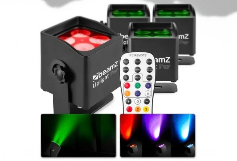 Lot de 4 ou 8 projecteurs d'ambiance sur batterie avec 25 heures d'autonomie. LED 4 en 1 RGBW, Mode audio auto ou manuel, fournis avec une télécommande. Utilisation en intérieur et extérieur (IP65).
