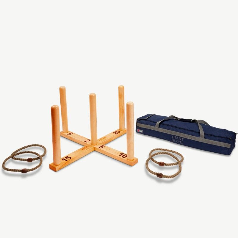 Lot de 4 jeux de lancer & d'adresse : Le Jeu des Anneaux Géant (1 mètre) + Le TacTac Golf + Le Cornhole double planche + Le Bowling gazon (Quilles 21cm). Ces jeux se jouent sur gazon.
