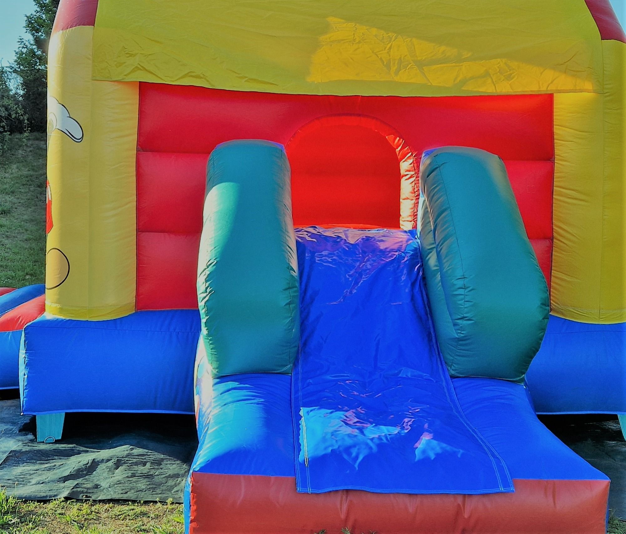 Structure gonflable festif avec un espace trampoline couvert, un toboggan de sortie et décor coloré sur le thème de la fête🎈